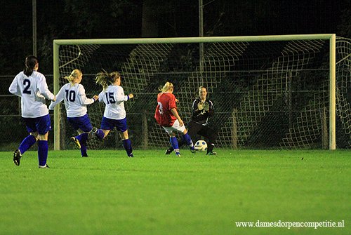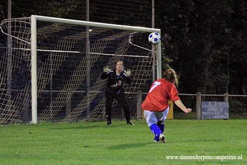 De keepster van fc Fochteloo heeft voor de rust een fantastische redding. De ruststand is 10-0