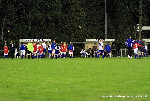 De aftrap werd genomen door de dames van vv Bakkeveen. In de 8ste minuut wordt door Miranda Ekas de 1-0 gemaakt voor de dames van vv Bakkeveen. Miranda Ekas en Samantha Kool hebben een prachtig een-tweetje waardoor de 2-0 en 3-0 wordt gemaakt. Deborah Rozema, de laatste vrouw van de dames van vv Bakkeveen, wordt in de spits gezet. Zij scoort de 10-0.